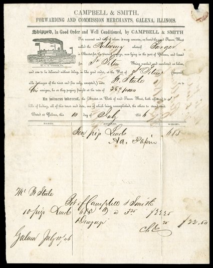 choice.The Express was a side-wheeler of 192 tons built atS.B. EXPRESS, complete stencil cachet of folded partially printed May 31, 1851 Bill of Lading for "Five Kegs of Liquor" and other merchandise to Belview, Iowa, extremely fine and choice.The Express was a side-wheeler of 192 tons built at West Elizabeth, Pa. in 1850. She operated in the Upper Mississippi trade until she was lost in 1855 (Image) Est. $750-1,000
