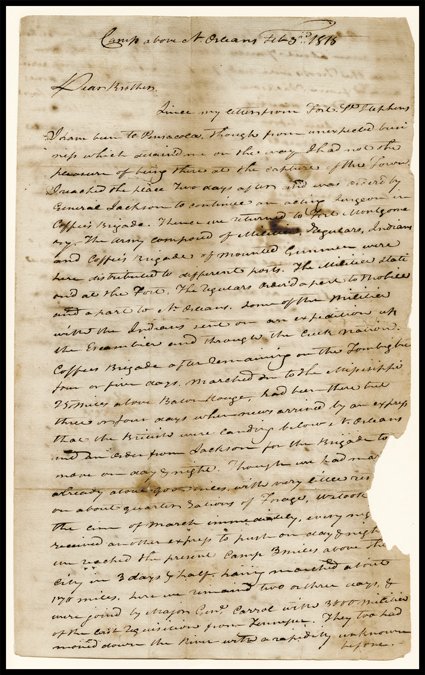 itself. Both are to his brother John in New Glasgow, Virginia. The first[Battle of New Orleans] Two extraordinary letters by Robert L. Cobbs, surgeon in Andrew Jackson's army, on the movements prior to the Battle of New Orleans and on the battle itself. Both are to his brother John in New Glasgow, Virginia. The first, written at Ft. St. Stephens (Mississippi Territory, now in Alabama) on October 4, 1814, says that in response to Jackson's request for militia:"Brig. Genl. Coffey has raised about Two thousand perhaps Twenty five hundred and marched on to Fort Montgomery which is on the Mobile about fifty miles above Mobile Town and as far below this place...The whole army took up the line of march...and in a week more perhaps...the Capture of Pensacola will be effected… I am acting at present as a surgeon extraordinary and have remain'd in that capacity about two weeks in the Chickasaw Nation and as long in the Choctaw. …" It would be a month before Jackson and his men captured Pensacola, which they achieved with little bloodshed. The Spanish governor of West Florida surrendered the town after it was flanked by Jackson's troops, which greatly outnumbered the civil garrison. From camp near New Orleans, Cobbs tells his brother on February 3, 1815 that he missed the capture of Pensacola, arriving two days late, when:"I was order'd by General Jackson to continue as acting surgeon in Coffee's Brigade. Thence we returned to Fort Montgomery. The army composed of Militia, regulars, Indians and Coffee's Brigade of mounted gunmen were here distributed...The Militia station'd at the Fort, the regulars order'd a part to Mobile and a part to N. Orleans. Some of the Militia with the Indians sent on an expedition...through the Creek nation. Coffee's Brigade after...four or five days, marched on to the Mississippi 25 miles above Baton Rouge, had been there but three or four days when news arrived...that the British wer landing below N. Orleans and an order from Jackson for the Brigade to move on day & night. Though we had mar(ched) already about 900 miles, with very little re(st)...we reached the present camp 3 miles above the city in 3 days & half, having marched about 170 miles."There they were joined by "3000 militia...from Tennessee" under Genl. William Carroll. "About 2 oclock P.M. News reached camp that the British were seen about 7 miles below the city, in half an hour the Troops were ready for a march...Within about a mile of the British the Brigade dismounted except the field and staff officers...I never heard the whizzing of balls so brisk. After the first attack the battle continued with much irregularity, several of our companies being in mistake call'd up to the enamy and several of theirs to ours. Several prisoners were taken in this manner...A number of our prisoners parol'd by the enemy, have just return'd. They report two chief-commanders dead (Generals Edward Pakenham and Samuel Gibbs) as we knew before, Major Genl. Keen (John Keane) recovering from his wound. The loss of the British as they state themselves in this expedition upwards of 3000 kill'd wounded and prisoners." He goes on to say that pleurisy, measles, and typhus are running through the ranks, and informs his brother that "Banks Anthony formerly of Bedford was killed in the battle on the 28th of Dec. by a rocket" before adding in a postscript that "The enemy lie off the passes into Lake Bourne, about 100 miles from N. Orleans. Their forces Naval & La(nd) are supposed to have been 12 or 15 thousand. The same that were at Washington & Baltimore with reinforcements. They told our prisoners that they should be reinforced and try for Orleans again. But all appearances indicated an early departure from our coast." Cobbs was quite correct. A few days after this letter, Fort Bowyer in Alabama was surrendered to the British after a brief siege, the last shots fired on land in the War of 1812. A peace treaty had been signed at Ghent in the Netherlands on December 10, though word had not yet reached the United States. First letter toned, with edge wear, seal hole (not affecting text )and several fold separations repairs. Second letter with a 2-inch piece out at the right edge of all pages, affecting sixteen lines of text. Toned, with edge wear and with fold separations and a few repairs with transparent paper. Both letters are tipped to pages in a tall folio presentation book with printed transcripts. Accompanied by a 1947 magazine article quoting the letters. Letters from this battle are extremely rare. (imagea) (Image) Est. $2,000-3,000