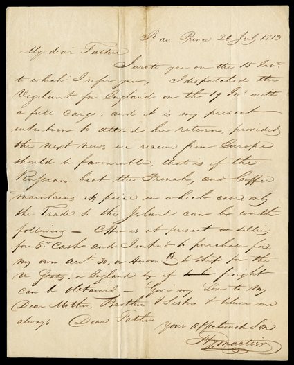 74   [Blockade-Run Correspondence from an American Businessman] Interesting series of 13 letters from Alexander Mactier to his parents in Baltimore, from various places, mostly Haiti