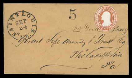 Territory datestamp to Camden, Maine, stopped in Chicago where oval Held fIllegal use of cut out 3c Nesbitt indicia, two examples, first with 3c Red on buff (#U10) indicia affixed to ladies cover and tied by "Little Falls, M.T./Feb 7" Minnesota Territory datestamp to Camden, Maine, stopped in Chicago where oval "Held for/Postage" handstamp was applied, apparently until the Little Falls postmaster sent money or the 3c Dull red (#26) which is tied by a Chicago datestamp, before continuing to its destination, the other a 3c Red on white (#U1) indicia affixed to a buff cover to Philadelphia with manuscript "Not Good" and "Saint Louis, Mo./Sep 24" datestamp and "5" due handstamp, very fine and unusual pair. (imagea) (Image) Est. $400-500