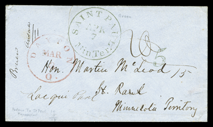 1076 c   Minnesota Territory - the incomparable postal history collection a most remarkable assemblage of over 165 covers with handstamped or manuscript town cancels from before Minnesota became a state on 11 May, 1858, including some with better frankings, advertising and accompanied by illustrated letterheads, mostly mounted and written up on album pages in four binders, most are scarce and seldom seen 1850's town cancels such as Sauk Rapids, Central Point, Minneiska, manuscript Silver Creek, manuscript Pine Island, Preston, manuscript and handstamped Marine Mills, two Owatonna, Stillwater tying left margin pair of 12c Black (#17) to England, two Le Sueur, Rochester in red and black, manuscript Little Canada, two different Fairbault, two Concord, Palestine, Osseo, two different Reeds Landing, Mantorville, Mazeppa, manuscript Sunrise City, manuscript and handstamped Cannon River Falls plus manuscript Cannon Falls and Cannon City, Belle Plaine, manuscript Belle Prairie, Saint Cloud, manuscript St. Augusta, Brownsville, Caledonia, Plain View, Pt. Douglass, manuscript and handstamped Mankato, manuscript and handstamped Taylor's Falls, manuscript Red Rock, Sauk Rapids, Saint Nicholas, manuscript Wacoota, manuscript and handstamped Northfield, four Saint Peter, blue rimless St. Marys, manuscript and handstamped Watab, manuscript Ft. Gains, two Fort Ripley, Stockton, Hokah, Excelsior in manuscript, handstamped in arc and circular datestamp. two different Glencoe, two different Monticello, Brantford, manuscript Elm Creek, manuscript High Forest, Oronoco, New Ulm, manuscript and handstamped Elk Horn, manuscript Sha-K'Pay and three handstamped Sha-K'pay, three Traverse des Sioux, manuscript and handstamped Ninninger, ten various Saint Anthony's Falls, manuscript Young America, Wasioja, etc., some usual stamp and cover faults, largely fine-very fine covers and strikes; the largest and most diverse collection of Minnesota Territory covers ever assembled that took Mr. Risvold over 50 years of diligent searching to amass.This collection served as the basis for the book The Minnesota Territory In Postmarks, Letters, And Covers by Floyd E. Risvold that was published by the Collectors Club of Chicago in 1985. Est. $10,000-15,000