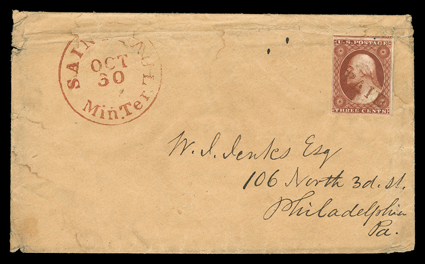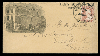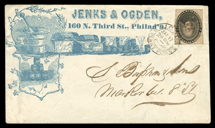 Saint Paul, Min. Ter.Feb 12 datestamp and additionally cancelled[The First postage stamps in Minnesota Territory], Ten Cent Black 1847 Issue (#2), four generous to huge margins, tied to buff cover to Jenks & Ogden at Philadelphia by green "Saint Paul, Min. Ter./Feb 12" datestamp and additionally cancelled by manuscript "X", fresh and extremely fine. Post Office records show that on 4 February, 1851 the postmaster at St. Paul received and signed for 200 five cent and 1,200 ten cent stamps of the 1847 issue. Eight days later J. Ridgway Jenks posted this cover. To date it is the only known 1847 issue cover from Minnesota Territory. Accompanied by 1991 PF certificate stating that the datestamp is dark blue, with which opinion we respectfully disagree, illustrated in The United States 1847 Issue: A Cover Census by Thomas J. Alexander on page 283.Accompanied by four additional related covers, the most important being a stampless cover from the same period with clear true green "Saint Paul, Min. Ter./Apr 7" datestamp and matching "5" rate handstamp, also two Jenks correspondence cover to Pennsylvania, one with 3c Orange brown (#10) cancelled by vivid red "PAID" with matching "Saint Paul, Min. Ter./Oct 30" datestamp, most likely an 1851 usage, the other a handsome illustrated Day & Jenks cover with 3c Dull red (#26, crease) tied by "Saint Paul, Min./Aug 7, 1860" postmark, and, lastly a Jenks & Ogden illustrated corner card cover in blue with Blood's Penny Post (1c) Black (#15L18) margins all around, cancelled by "1" in oval and tied by their double circle "Blood's Penny Post/Jan 17/Philada" handstamp, very fine group. (imagea) (imageb) (imagec) (imaged) (Image) Est. $10,000-15,000