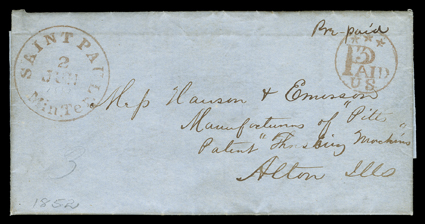 February datestamp with endorsement from a member of the House of RepreseSaint Paul, Minnesota Territory, pair of covers with matching black and red postmarks and fancy "Paid 3" ornamental rate handstamps with three stars, first in black with 24 February datestamp with endorsement from a member of the House of Representatives to Robin's Nest, Illinois, the other in red on 1852 folded letter with integral address leaf to Alton, Illinois endorsed "Pre-paid", first with harmless paper tape repair over partially missing flap, otherwise a very fine pair. (imagea) (Image) Est. $1,000-1,500