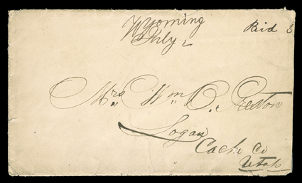 fine.The following extract is by Wm. B. Preston, captain of a wagon train,Wyoming, Nebraska Territory, manuscript July 2 postmark and "Paid 3" on 1864 cover with original letter to Logan, Utah, slightly reduced at right and tear at bottom right, fine.The following extract is by Wm. B. Preston, captain of a wagon train, to his wife in Logan, Cache County, Utah: "Wyoming, July 2, 1864... I have been here eleven days....am waiting for the boats with supplies to come up the river...I have loaded about forty wagons with from fourteen to fifteen hundred pounds and ten to twelve passengers and packed most of the wagons to the bows for the trip to Salt Lake...No chance to ride this time....All Danes, Swedes and a few Dutch for Providence...The Sam Pete [leader of another wagon train] teams take English, Welch and half Americans, Jolly crowd that." His wagon train was delayed until September before starting for Salt Lake City.The Wyoming Post Office was established in Otoe County 21 November, 1856. It was a Missouri River steamboat landing and staging point for Mormon emigration and freighting operations to Salt Lake City in 1864-66. Those in charge of operating the wagon trains waited at Wyoming for steamboats to bring the passengers and supplies before starting overland to Salt Lake. In all 22 organized companies started from Wyoming during the three years of operation. (Image) Est. $500-750