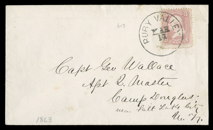 Camp Douglas, Utah Territory with 3c Rose (65) tied by clear Ruby[Overland Mail Stations in Nevada Territory], two covers, first with manuscript "Fort Churchill, N.T./Aug 18, 1861" and "Paid 10" on cover to Dewitt, N.Y., the second a cover to Camp Douglas, Utah Territory with 3c Rose (#65) tied by clear "Ruby Valley/Mar 17" datestamp, with original 1863 letter, first with vertical fold at right and bits of flap missing, still a very fine duo; former ex-Boughman.The Ruby Valley Post Office was established on 30 April, 1862 in what was the Utah Territory. On 14 July, 1862 it became part of the Nevada Territory. It is likely that this Ty. I postmark once contained the designation "Utah T." or "U.T." which would have been cut out on the charge of territory.The purpose of having posts at these places was to prevent the Shoshone Indians from attacking the emigrants, mail stations and settlers. The soldiers from Fort Ruby policed the Overland Trail both ways - east to Deep Creek Station on the Nevada-Utah line, and west as far as Austin, Nevada. (imagea) (Image) Est. $1,000-1,500