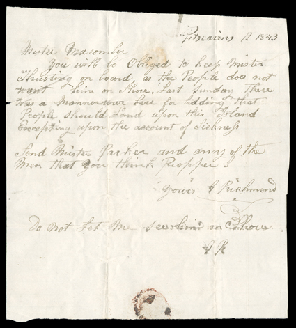 captain of the barque America ordering the first mate to take a[Pitcairn Islands - Early Letters] 1843 letters from Captain Gilbert Richmond while at the Pitcairn Islands, two letters, one datelined "Pitcairn Friday 2 1843" (March) from the captain of the barque America ordering the first mate to take a group of Islanders to Elizabeth Islands and back, the other is datelined "Pitcairns 12? 1843" also from Captain Richmond to the first mate "Mr. Macomber" ordering to keep "Mr. Thusting" on board "as the people do not want him on shore", fine; the barque America was a whaler out of Bristol, R.I. and fist appeared off Pitcairn Island in 1841; believed to be the earliest letters from the Pitcairn Islands. (imagea) (Image) Est. $4,000-5,000