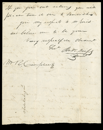 handstamped Paid and manuscript 6(d) rate and Via Albany direcMatthews, William W., folded Autograph Letter Signed with integral address leaf datelined at "Montreal 12th April 1823" to Robert Stuart, Michilimackmac, Michigan Territory with handstamped "Paid" and manuscript "6"(d) rate and "Via Albany" directive, rated "18 3/4" for US postage, fresh and very fine. Matthews, Astor's agent in Montreal, writes: "Dear Sir/ Your favor of 17th October last by Mr. Currie came to hand in Nov. I have orders to bring the men you speak of but not the Cook. You are aware of the new arrangements to the east ward, and things go on quietly here - the H.B. (Hudson Bay Co.) have all their own way - they have engaged Some men conditionally to winter or return in the fall as may be required. I am told they have Seized all the petty traders who were within their limits - young Forrest with the others, it is also stated that Some of our people have met with the same fate!""I will try and bring you a Dog but as yet I have Seen none to Suit. .. I have a Small order to execute for Mr. Rolette, the Same you speak of I presume- Varin is doing nothing nor will he pay the amount I hold against him … mens wages Same as last year … W.W. Matthews" (Image) Est. $750-1,000