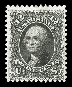 $1,200.00).#69, 12c Black, unused, exceptionally well centered and margined, strong color, regummed, extremely fine; 1973 PF certificate (as o.g.) and a 2008 PSE certificate (XF 90; SMQ $1,200.00). (Image) $800.00