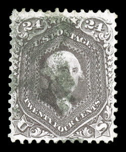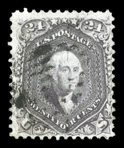 unusual trait on this value), strong rich color and a crisp impressio#70, 24c Red lilac, used, far better centering within much larger margins than typically encountered, in fact, the design is completely clear of the perforations all around (an unusual trait on this value), strong rich color and a crisp impression, extremely fine; 2005 PSE certificate (VF 80 - too conservative in our opinion; SMQ $360.00); ex-"Elite". (Image) $300.00
