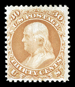 certificate ex-Frohnen.#71, 30c Orange, centered slightly to the left but actually better centering than the majority of mint examples, unusually strong color, o.g., lightly hinged, fine; 1998 PF certificate; ex-Frohnen. (Image) $2,600.00