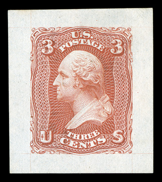 choice.#74TC2, 3c Scarlet, small die proof in India, full large margins all around, brilliantly fresh, tiny natural India paper irregularity, extremely fine and choice. (Image) $375.00