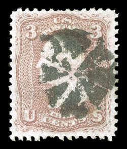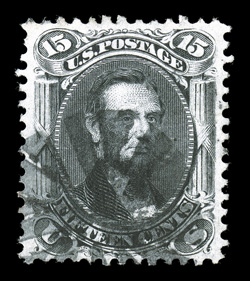 fine.#91, 15c Black, "E" grill, striking used example, cancelled both by a bold leaf type postmark and a bit of a red transit c.d.s. as well, attractively centered, strong color, very fine. (Image) $800.00