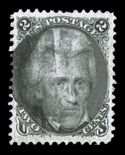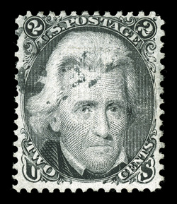cancel, extremely fine 2009 PF certificate.#93, 2c Black, "F" grill, a highly desirable used example, exceedingly well centered within extraordinarily large margins all around, strong color and impression, light cork cancel, extremely fine; 2009 PF certificate. (Image) $60.00