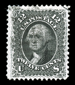 flawlessly well centered within them, additionally its color is quite str#90, 12c Black, "E" grill, a magnificent used example of a stamp that is rarely encountered in such outstanding quality, possessing enormous margins for the issue and being flawlessly well centered within them, additionally its color is quite strong and its impression uncommonly clean and sharp on bright paper, neat circle of wedges cancel, extremely fine in every regard; a stamp for the collector who seeks out used stamps in only the finest quality available; 1990 and 1999 PF certificates. (Image) $400.00