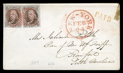 margins to well clear at upper left, tiny crease in the margin at top#1a, 5c Dark brown, two singles, both with intense color and detailed impression, the right stamp with large to very large margins all around, the left stamp with mostly large margins to well clear at upper left, tiny crease in the margin at top left, tied by two strikes of red square grid to cover to Beaufort, South Carolina, matching "New-York/Feb 24" datestamp alongside and orange straightline "Paid" handstamp, cover with tear and stain at top right, still very fine and attractive; unlisted in the Alexander census. (Image) Est. $500-750