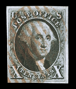 fine.#2, 10c Black, pos. 67R, eye-catching used single, with prooflike color and impression on crisp clean paper, mostly large margins to ample at base, vivid red grid cancel, very fine. (Image) $1,250.00