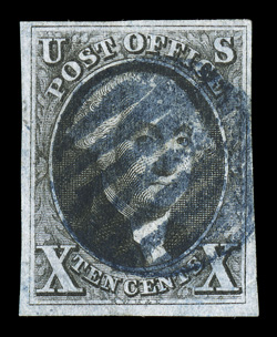 appearance.#2, 10c Black, pos. 12L, used, ample to mostly large margins all around, rich color and sharp impression, black grid cancel, light diagonal crease at bottom right, very fine appearance. (Image) $1,600.00