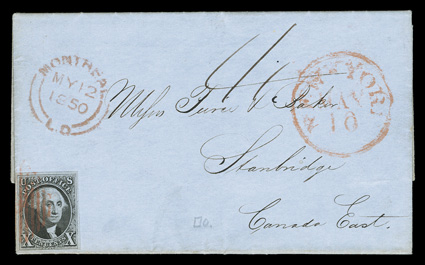 New-YorkMay 10 datestamp, red Montreal, L.C.My 12, 1850 trans#2, 10c Black, large to very large even margins all around, prooflike color and impression, tied by red square grid to 1850 folded letter to Stanbridge, Canada East, matching "New-York/May 10" datestamp, red "Montreal, L.C./My 12, 1850" transit postmark and ms. "4 1/2"(d) rate, red St. Johns, L.C./My 13" backstamp, druggists' return label on reverse, extremely fine; unlisted in the Alexander census. (Image) $2,000.00