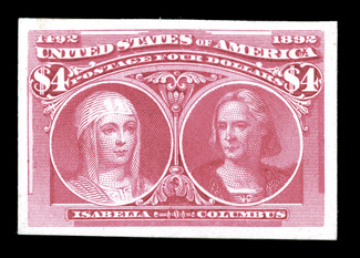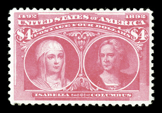 stamp.#233, 4c Columbian, well centered within exceptionally large margins, fresh color, o.g., n.h., extremely fine; 1988 PF certificate for a pair, this being the right stamp. (Image) $200.00