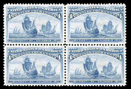 466 nhbl 233 233, 4c Columbian, striking mint block of four, beautifully centered within large margins, strong rich color, o.g., n.h., extremely fine.#233, 4c Columbian, striking mint block of four, beautifully centered within large margins, strong rich color, o.g., n.h., extremely fine. (Image) $800.00+