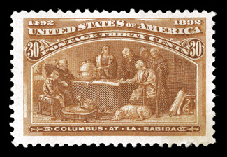 at bottom right, otherwise and extremely fine jumbo.#239, 30c Columbian, spectacular appearing mint single, sporting humongous margins and being exceedingly well centered within them, rich luxuriant color, o.g., tiny perf. scuff at bottom right, otherwise and extremely fine jumbo. (Image) $240.00