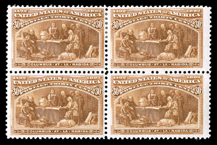 477 nh 239 239, 30c Columbian, well centered within uncommonly large margins, fresh color, o.g., n.h., very fine 2000 PF certificate for a block of four, this being the bottom right