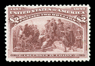 intense than usual on bright crisp paper, o.g., never hinged, an extreme#232, 3c Columbian, a magnificent quality mint single, featuring not only flawless centering amid extravagantly large margins, but its color and impression are also far more intense than usual on bright crisp paper, o.g., never hinged, an extremely fine gem with outstanding eye appeal; 1986 PF certificate and a 2005 PSE certificate (Superb 98; SMQ $2,300.00); only three stamps grade higher (all 98J); ex-Welling. (Image) $135.00