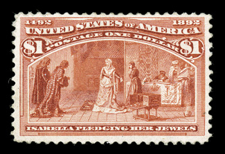 PF certificate.#237, 10c Columbian, pristine mint single, with sumptuously black brown color and a razor-sharp impression, exceedingly well centered, immaculate o.g., n.h., extremely fine; 1996 PF certificate. (Image) $325.00