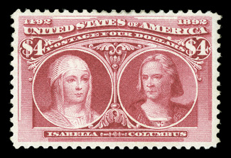 certificate.#244, $4.00 Columbian, well centered and margined, bright color, full o.g., lightly hinged, choice very fine; a desirable example of this popular stamp; 1997 PF certificate. (Image) $2,250.00