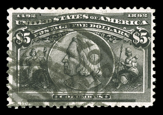496 O 245 245, $5.00 Columbian, used, strong impression, registry oval cancel, faint trace of a crease at bottom right, otherwise fine clear 1984 PF certificate.#245, $5.00 Columbian, used, strong impression, registry oval cancel, faint trace of a crease at bottom right, otherwise fine; clear 1984 PF certificate. (Image) $1,500.00
