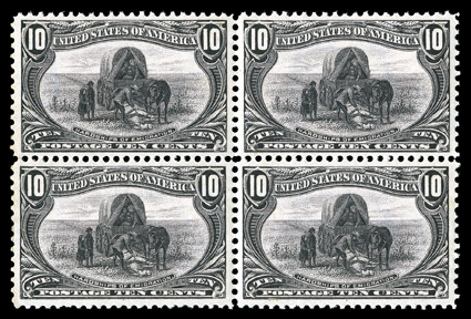 fine.#290, 10c Trans-Mississippi, mint block of four, excellent centering, strong rich color, o.g., n.h., several small gum skips on the top left stamp, extremely fine. (Image) $1,900.00+