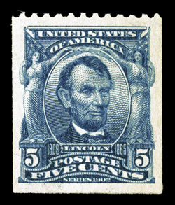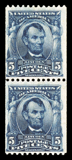of preservation than the vast majority, with strikingly intense#317, 5c Blue coil, perf. 12 horiz., an incredibly fresh mint pair of this experimental coil rarity of which fewer than ninety pairs are recorded, in a much more brilliant state of preservation than the vast majority, with strikingly intense color and a crisp detailed impression on considerably brighter paper than usual, nicely centered, full clean o.g., top stamp with minor h.r., bottom stamp lightly hinged, very fine; 1953 APS, 1984 and 1995 PF certificates. (Image) $17,500.00