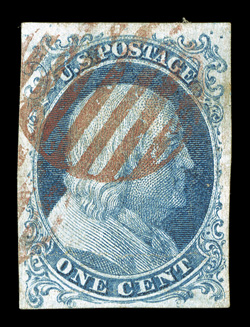 the best, possessing exceptionally large margins all around, bright#5A, 1c Blue, Ty. Ib, position 8R1E, an extraordinarily handsome appearing used example of this very rare stamp, being one of two positions that are considered to show this type the best, possessing exceptionally large margins all around, bright early color and a highly detailed impression which shows the Ty. Ib design characteristics exceedingly well, bright red grid cancel, two light horizontal creases which do not detract from this stamp's extremely fine and impressive overall appearance; 1974 and 2009 PF certificates. (Image) $16,000.00