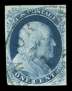 extraordinarily large and marvelously balanced margins, plus its color is a wonder#8A, 1c Blue, Ty. IIIa, position 51R4, the used example offered here is one of the most appealing singles of this scarce stamp we have offered, as it features four extraordinarily large and marvelously balanced margins, plus its color is a wonderfully warm rich shade and impression is quite detailed, showing the Type IIIa characteristics well, including a large break in the top label, a neat town cancel further adds to this stamp's overall desirability, extremely fine; used gem examples this well margined are few and far between; 1995 PF certificate. (Image) $1,200.00