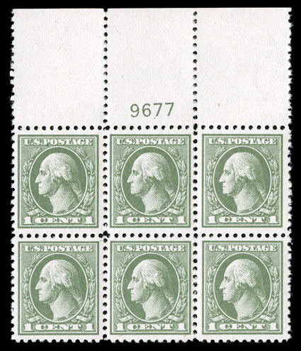 ex-Gray.#525, 1c Gray green offset, full top margin plate no. 9677 block of six, wonderfully well centered, crisp and intact, pristine o.g., n.h., extremely fine; ex-Gray. (Image) $50.00