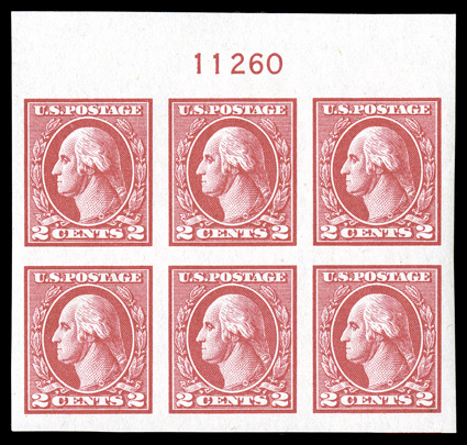 usual paper inclusions, immaculate o.g., n.h., extremely fine ex-#533, 2c Carmine offset imperforate, Ty. V, choice top margin plate no. 11260 block of six, with oversized margins all around, rich color on crisp clean paper without any of the usual paper inclusions, immaculate o.g., n.h., extremely fine; ex-"Saddleback." (Image) $1,800.00