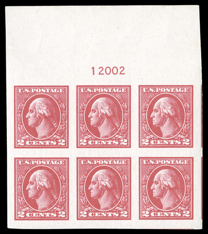 n.h., extremely fine.#527, 2c Carmine offset, Ty. V, lovely full top margin plate no. 11156 block of six, particularly well centered, bright and fresh, with strong and intact perforations, o.g., n.h., extremely fine. (Image) $350.00