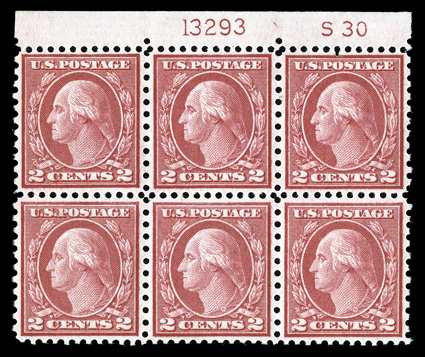742 ogPB 526 526, 2c Carmine offset, Ty. IV, full top margin plate no. 10896 block of six, virtually perfect centering, intense color, o.g., five stamps n.h., top center stamp lightly