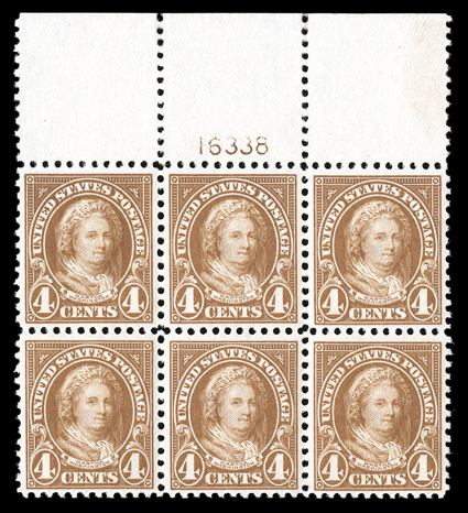 amid balanced margins, incredibly fresh and bright, with strong perforat#556, 4c Yellow brown, an especially handsome full top margin plate no. 16338 block of six, magnificently well centered throughout, with each stamp being flawlessly centered amid balanced margins, incredibly fresh and bright, with strong perforations al around, immaculate o.g., n.h., an extremely fine gem; a plate block condition rarity. (Image) $400.00