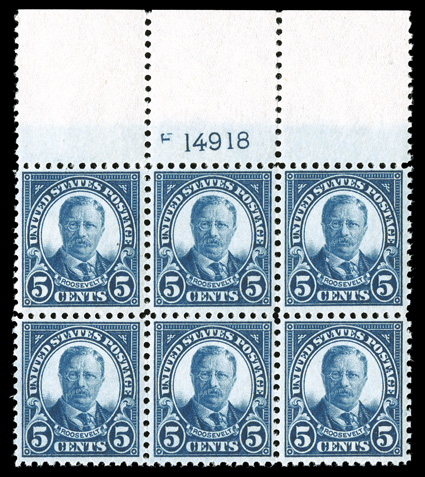 the entire plate block, plus its colors are particularly fresh and inte#573, $5.00 Carmine and blue, an incredibly handsome and choice full top margin arrow and plate nos. F14326, F14327 block of six, possessing near perfect centering throughout the entire plate block, plus its colors are particularly fresh and intense, immaculate o.g., n.h., extremely fine; one of the finest quality examples of this popular plate block rarity we have offered. (Image) $3,500.00