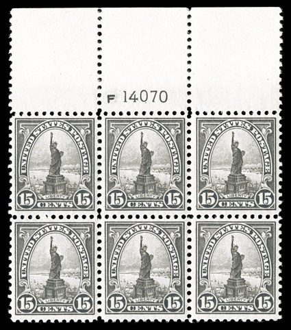 wonderfully well centered, deep rich color, immaculate o.g., n.h., an extreme#566, 15c Gray, a highly select full top margin plate no. F 14070 block of six, being one of the nicest never hinged full top examples of this plate block we have seen, wonderfully well centered, deep rich color, immaculate o.g., n.h., an extremely fine gem; 2005 PF certificate; ex-Fogelson. (Image) $425.00