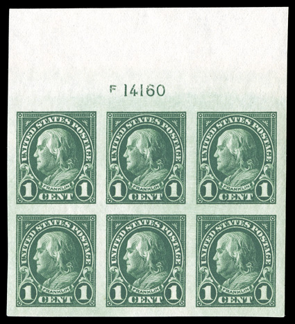o.g., n.h., an extremely fine gem.#575, 1c Green imperforate, striking full top margin plate no. 14160 block of six, featuring lavishly wide and even margins, deep luxuriant color and crisp white paper, pristine o.g., n.h., an extremely fine gem. (Image) $115.00