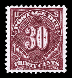 rich color, unobtrusive cancel, extremely fine used gem 2009 PSE certi#J43, 30c Deep claret, a marvelous used example, featuring large and extraordinarily well balance margins which are especially difficult to find on postage due stamps, strong rich color, unobtrusive cancel, extremely fine used gem; 2009 PSE certificate (Superb 98; SMQ does not price used postage dues); the highest grade in the PSE population report and the only example to be so graded. (Image) $75.00