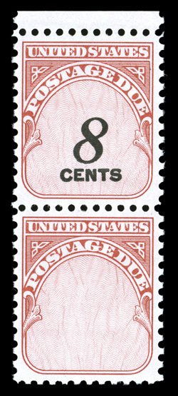 o.g., n.h., extremely fine a rare error as only twenty such erro#J96a, 8c Carmine rose pair, one with "8 cents" omitted, choice top right corner sheet-margin vertical pair, the bottom stamp being the error, exceptionally well centered, fresh, o.g., n.h., extremely fine; a rare error as only twenty such error pairs exist according to the Datz catalog; 2007 PSE certificate. (Image) $850.00