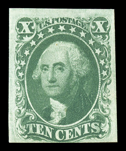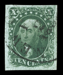 a very fine example of this scarce mint stamp 2005 PSE certific#15, 10c Green, Ty. III, with a stitch watermark, three large margins, just touching the design at bottom, strong rich color and a highly detailed impression, full original gum, a very fine example of this scarce mint stamp; 2005 PSE certificate. (Image) $5,000.00