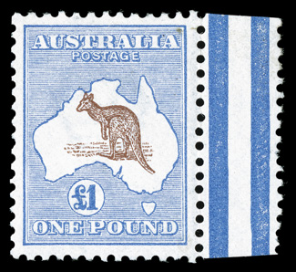 choice (S.G. 15 £1,900).#14, 1913 £1 Ultramarine and brown, handsome right margin interpanneau single, exceedingly well centered, marvelously bright and fresh, o.g., lightly hinged, very fine and choice (S.G. #15; £1,900). (Image) $3,250.00