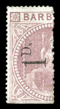 Brandon certificate (as part original gum) and a 2009 BPA certificate (S#57, 1878 "1d." surcharge on half of 5/- Dull rose, rare unused example, warm color, regummed, faint trace of a crease, fine; signed H. Bloch and accompanied by a clear 2006 Brandon certificate (as part original gum) and a 2009 BPA certificate (S.G. #86; £5,000). (Image) $7,500.00