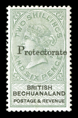 this series, strong rich color, full fresh o.g., very fine and choice#58, 1888 10/- Green, "Protectorate" ovpt., an extraordinarily handsome mint example of this high value rarity, possessing outstanding centering which is rarely encountered on this series, strong rich color, full fresh o.g., very fine and choice; 1975 BPA certificate; ex-"Sovereign" (S.G. #50; £4,250). (Image) $4,850.00