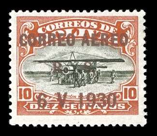 Bloch.#C13, 1930 10c Vermilion and black air post with brown overprint, bright colors, o.g., light gum bend, very fine; a rare airmail stamp, with only 50 issued; signed Sanabria, H. Bloch. (Image) $2,500.00