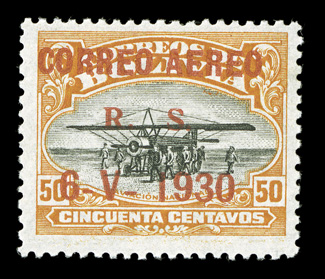 1251 og C17 C17, 1930 50c Orange and black air post with red overprint, lovely fresh colors, o.g., fine only 50 issued signed Sanabria, H. Bloch.#C17, 1930 50c Orange and black air post with red overprint, lovely fresh colors, o.g., fine; only 50 issued; signed Sanabria, H. Bloch. (Image) $1,000.00